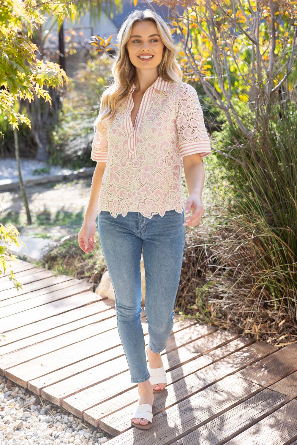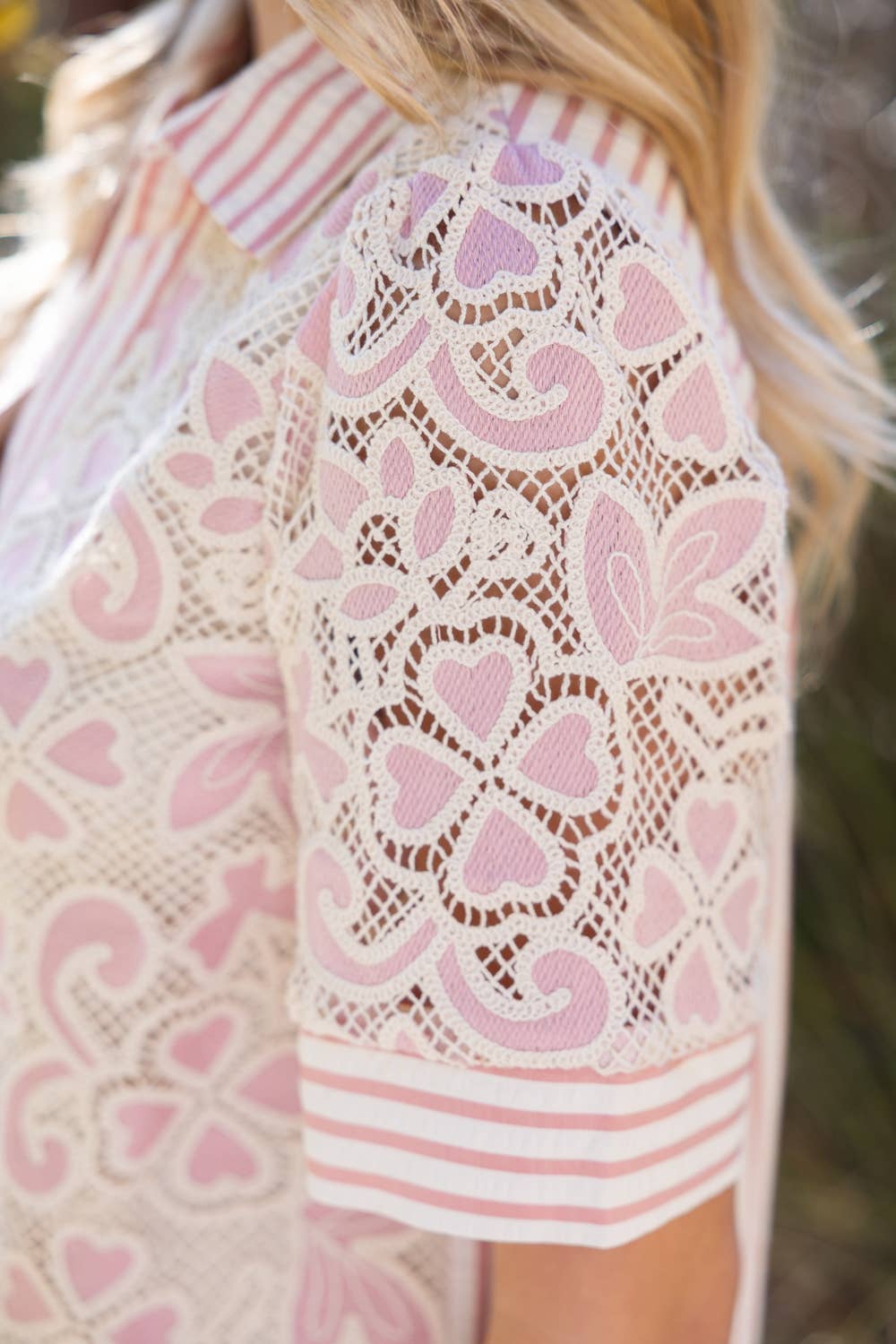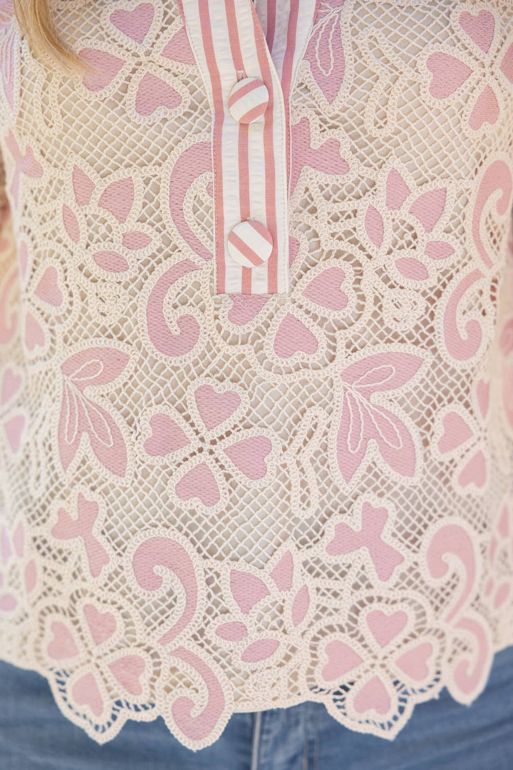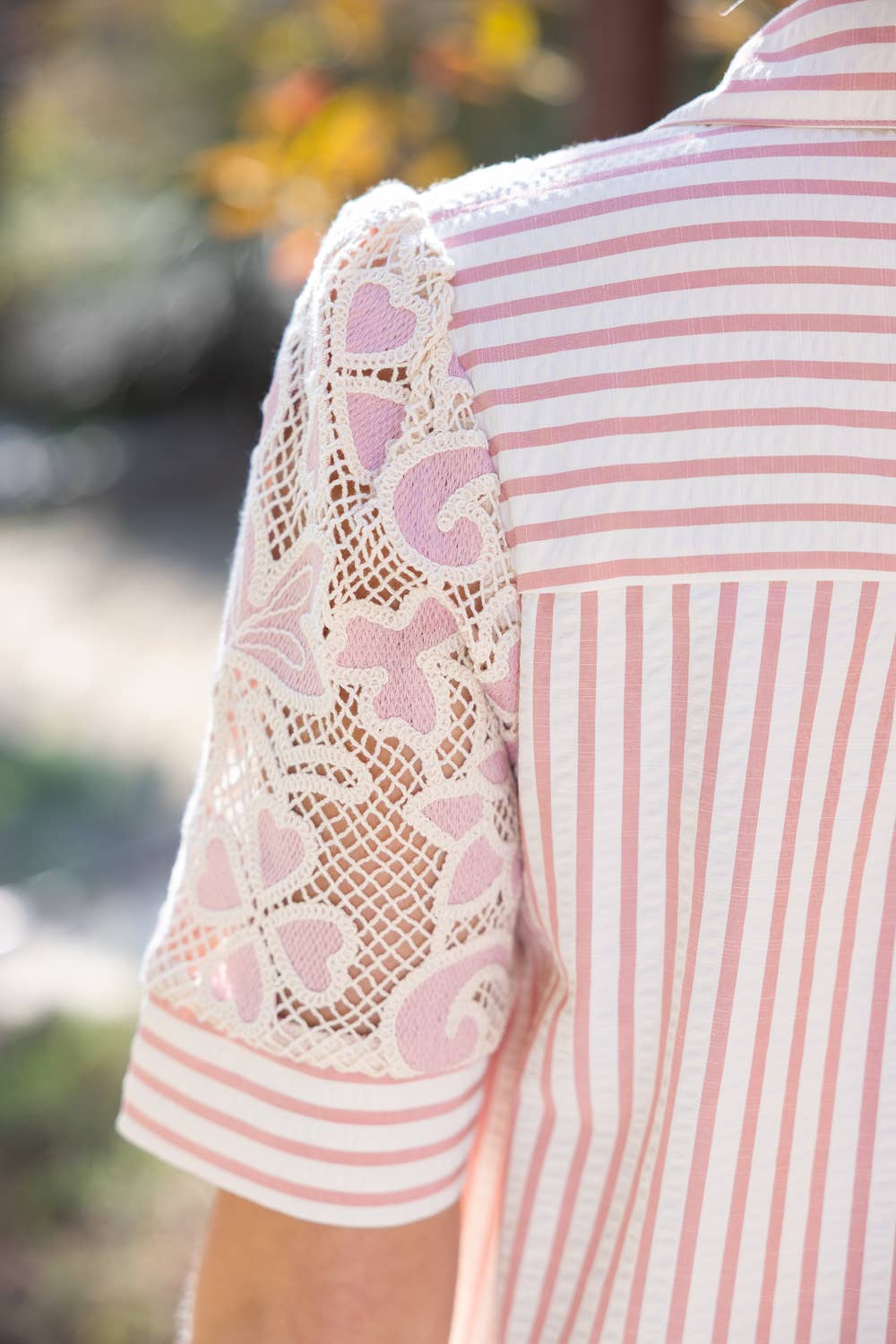 Short sleeve lace blouse featuring a striped button-front placket and contrast striped back panel, designed in a lightweight fabric with a feminine yet easy-to-wear silhouette. Perfect for spring and summer collections, this versatile top pairs effortlessly with denim for a polished boutique look