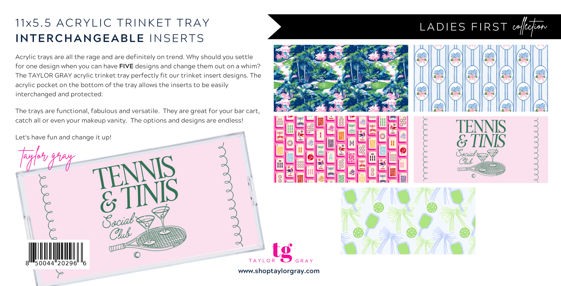 **The TAYLOR GRAY acrylic TRINKET TRAY is a 11x5.5 tray that perfectly fit our TRINKET insert designs. The patent pending pocket on the bottom of the tray allows the inserts to be easily interchanged and protected. Acrylic trays are all the rage and are definitely on trend. Why should you settle for one design when you can have FIVE designs and change them out on a whim?