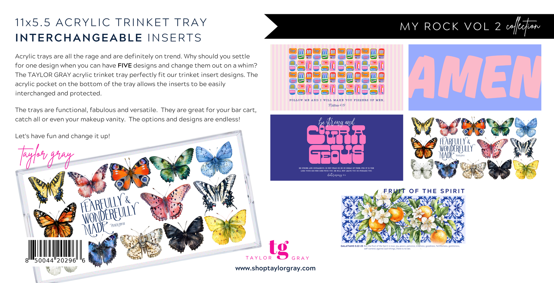 **The TAYLOR GRAY acrylic TRINKET TRAY is a 11x5.5 tray that perfectly fit our TRINKET insert designs. The patent pending pocket on the bottom of the tray allows the inserts to be easily interchanged and protected. Acrylic trays are all the rage and are definitely on trend. Why should you settle for one design when you can have FIVE designs and change them out on a whim?