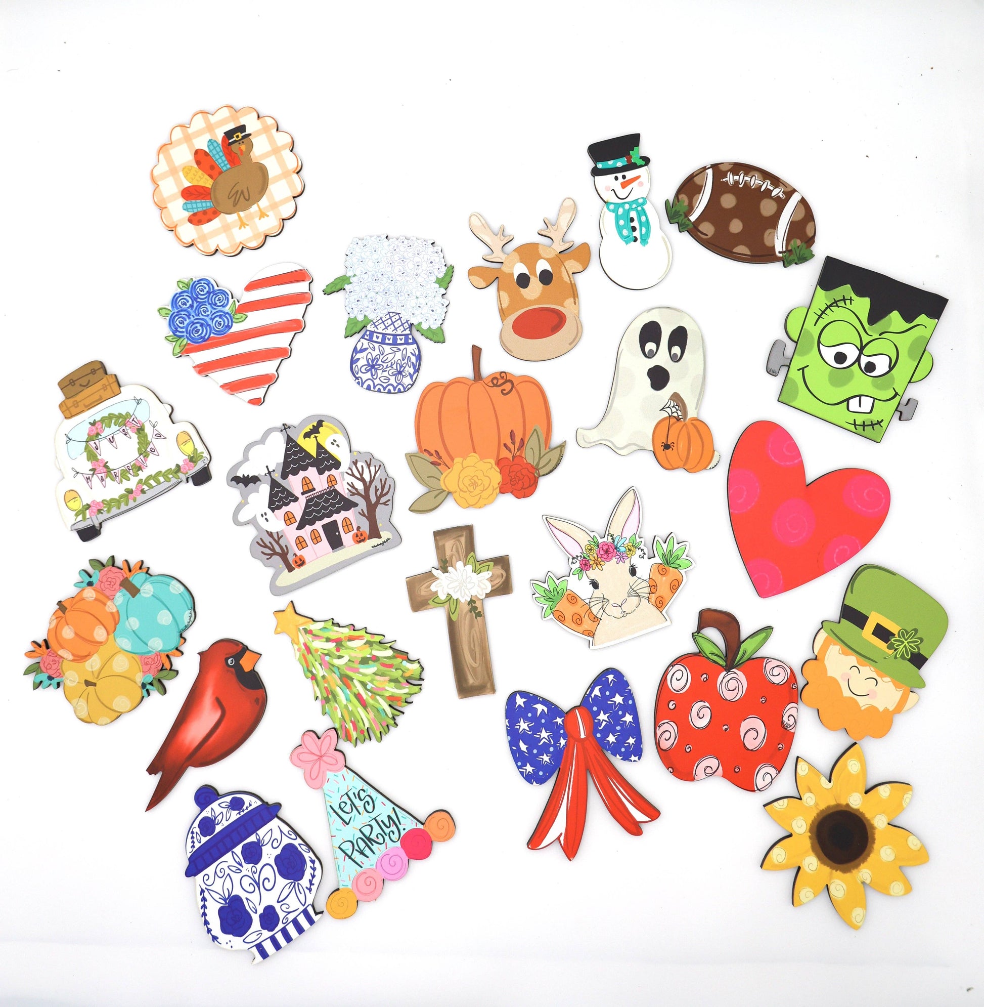 Each piece is UV printed on 1/8" thick material, making it lightweight yet durable. These attach seamlessly using Velcro and are ideal for refreshing your decor with seasonal flair—just peel one off and pop another on.