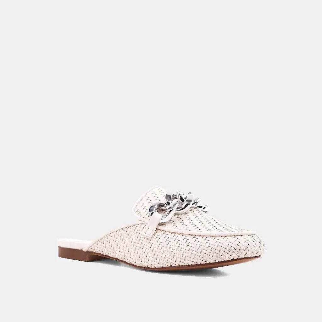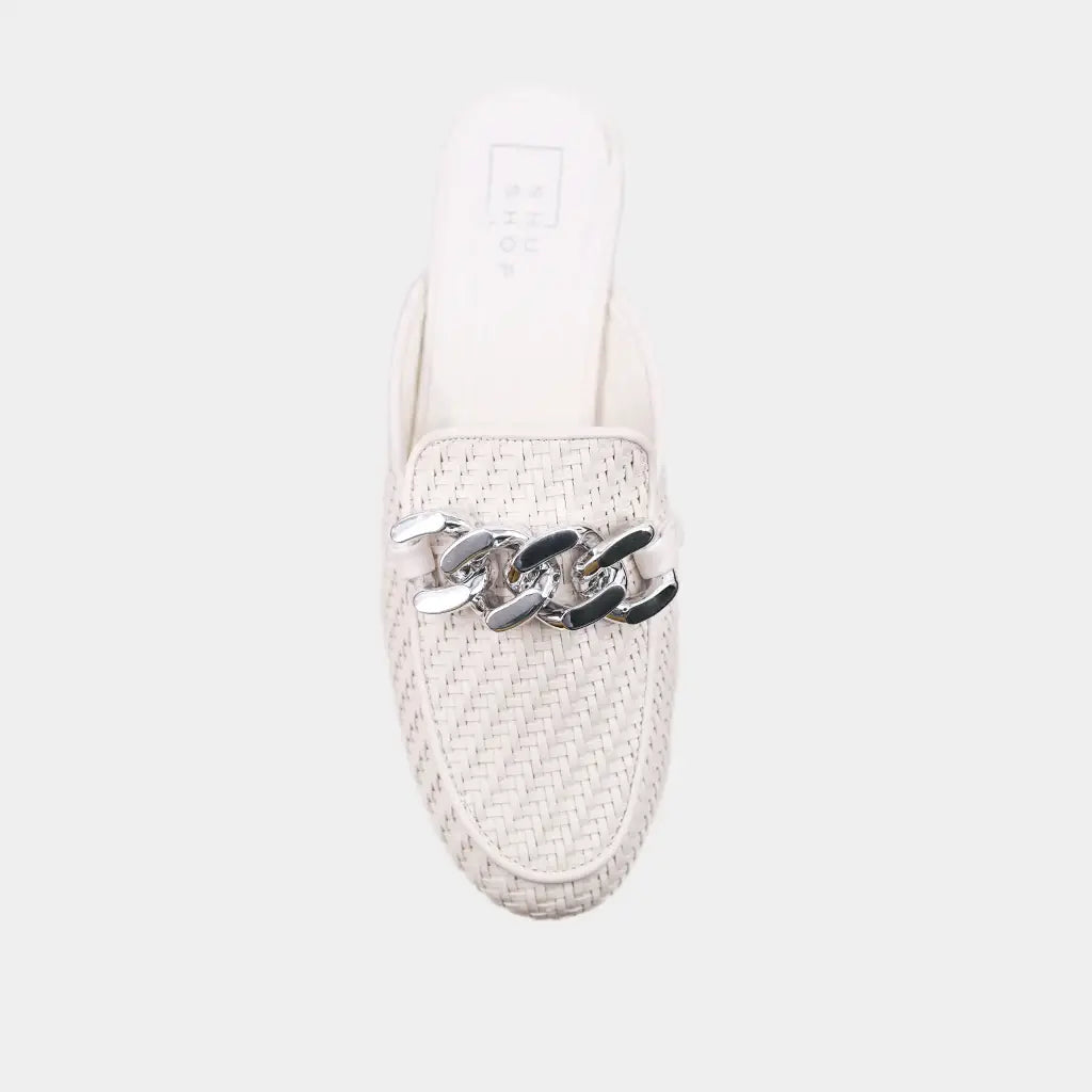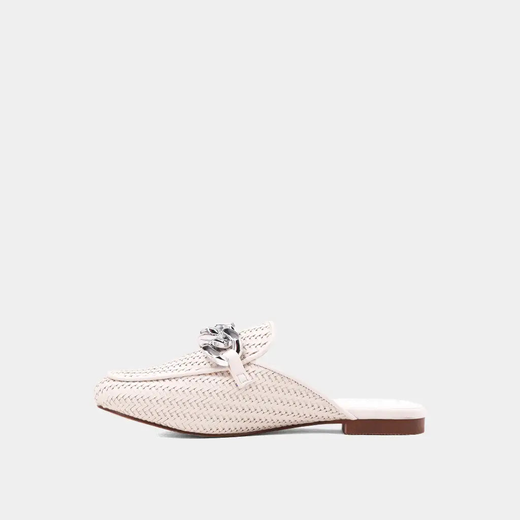 Elevate your style with the ALEXIS hybrid loafer-mule, now in crisp white. Crafted from intricately woven faux leather and adorned with a striking silver chain, this versatile piece adds a modern edge to any outfit. Whether for work meetings or weekend brunch, ALEXIS complements everything from tailored trousers to relaxed denim, making it the ultimate day-to-night essential.