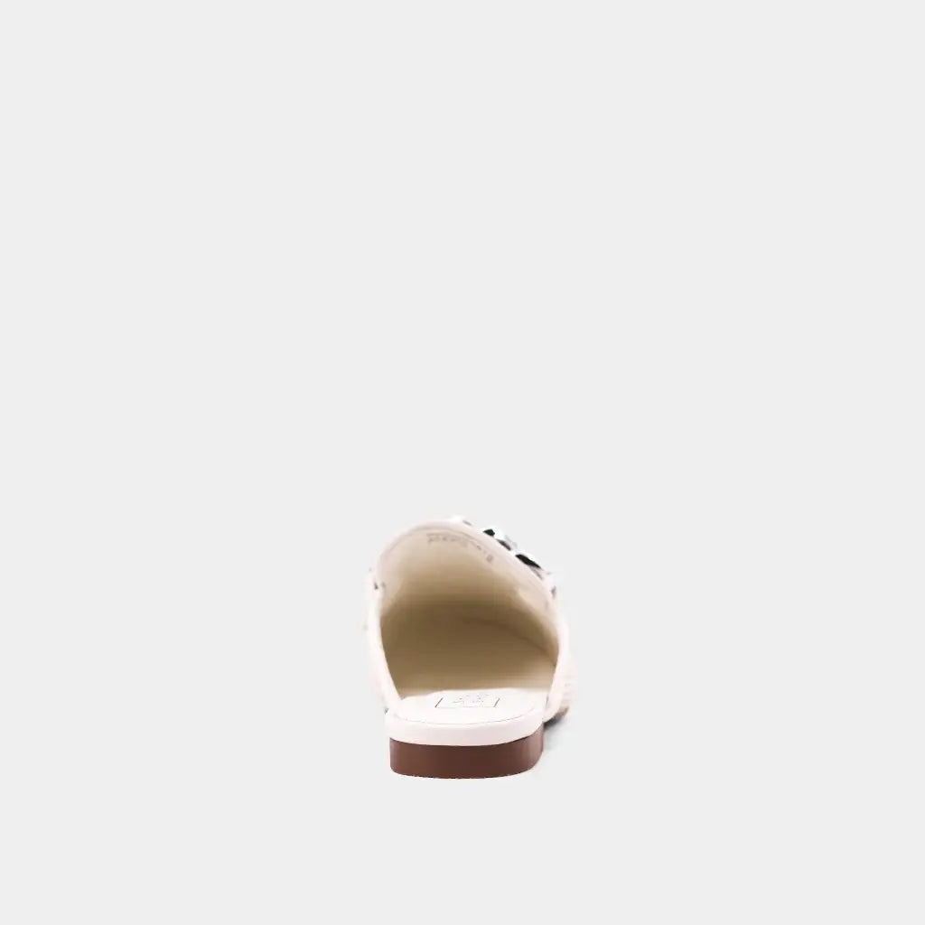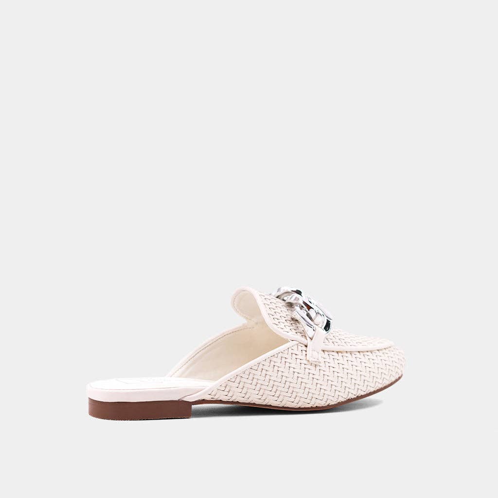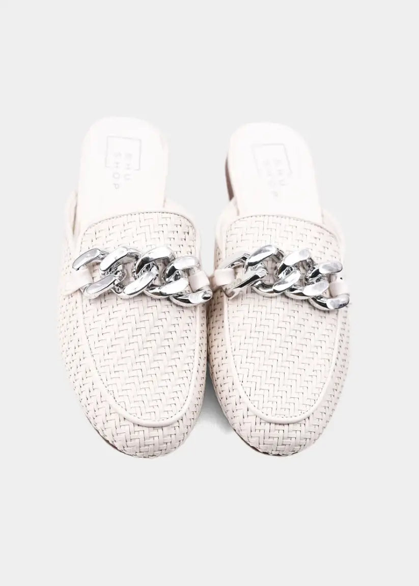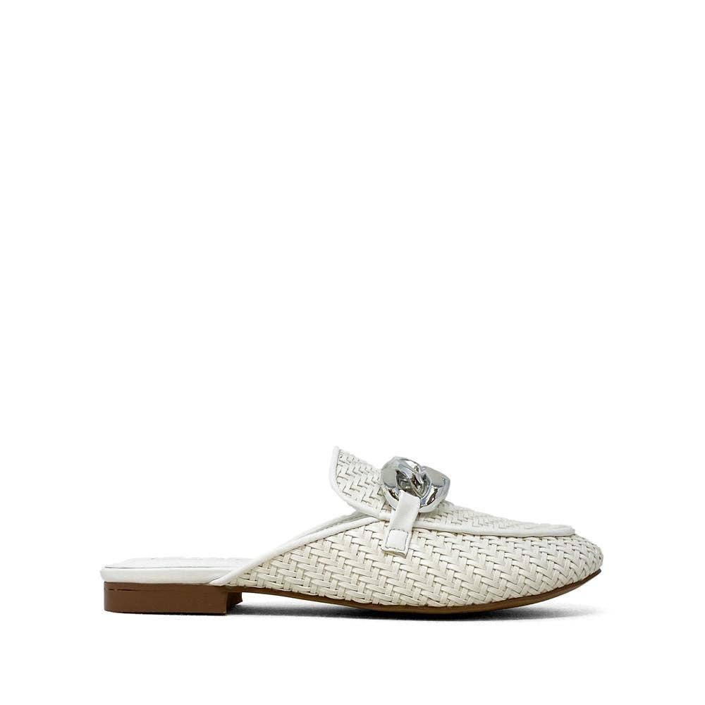 Elevate your style with the ALEXIS hybrid loafer-mule, now in crisp white. Crafted from intricately woven faux leather and adorned with a striking silver chain, this versatile piece adds a modern edge to any outfit. Whether for work meetings or weekend brunch, ALEXIS complements everything from tailored trousers to relaxed denim, making it the ultimate day-to-night essential.