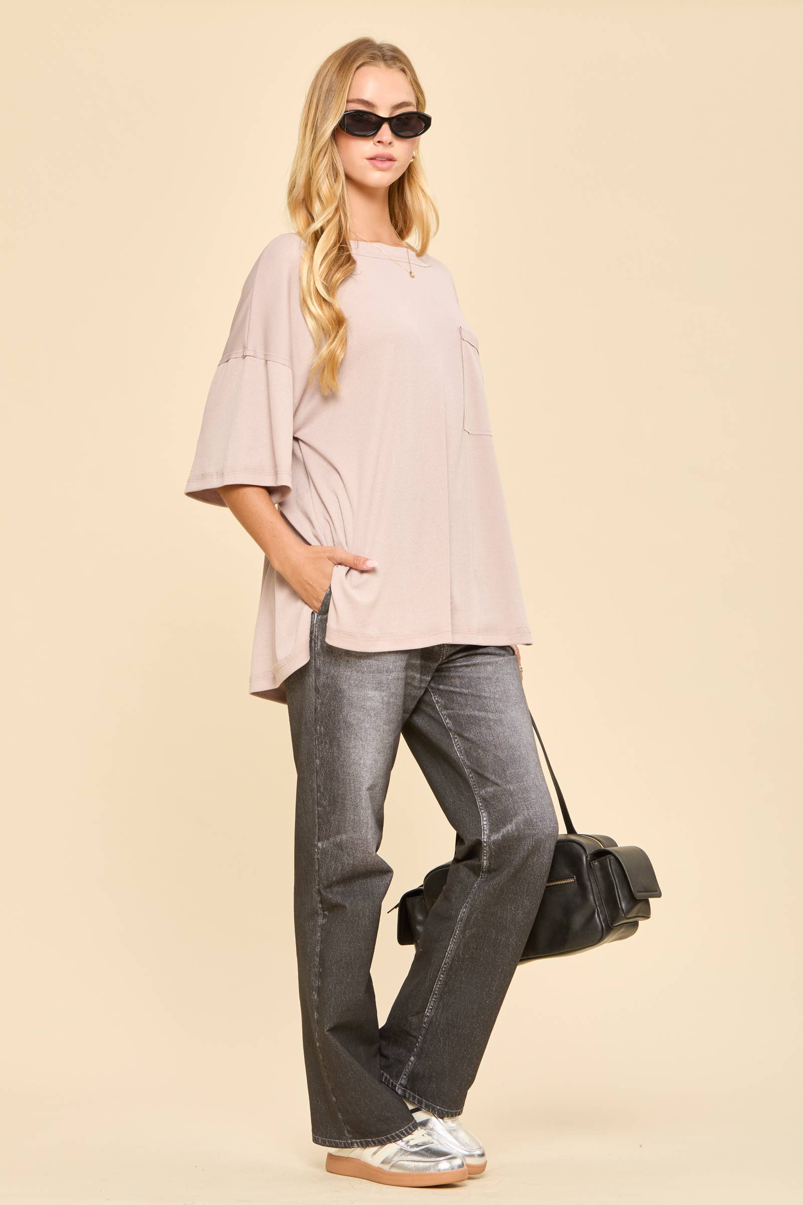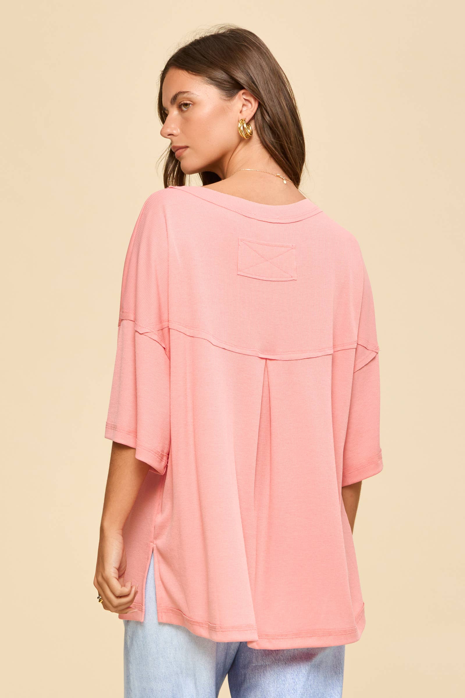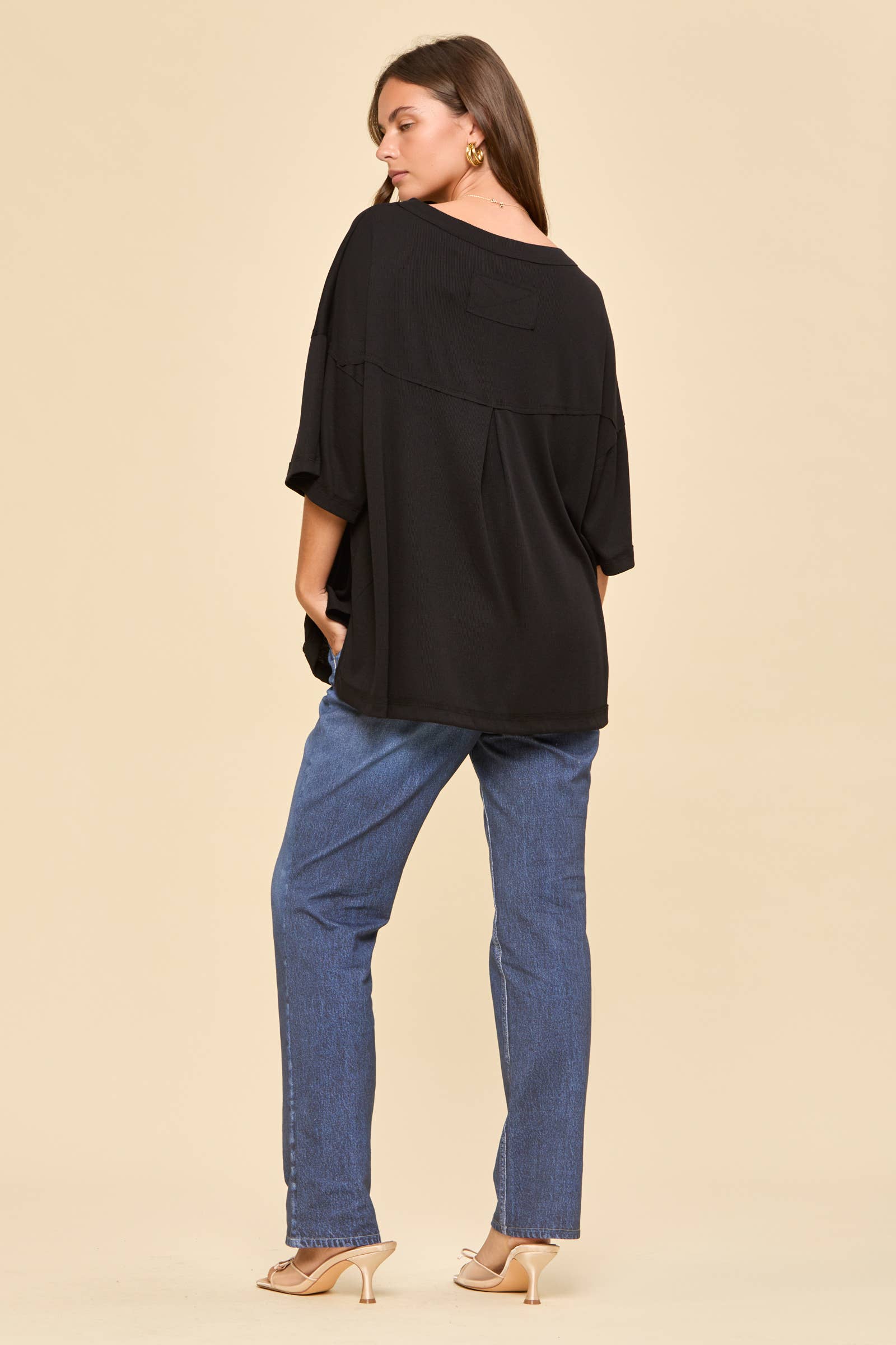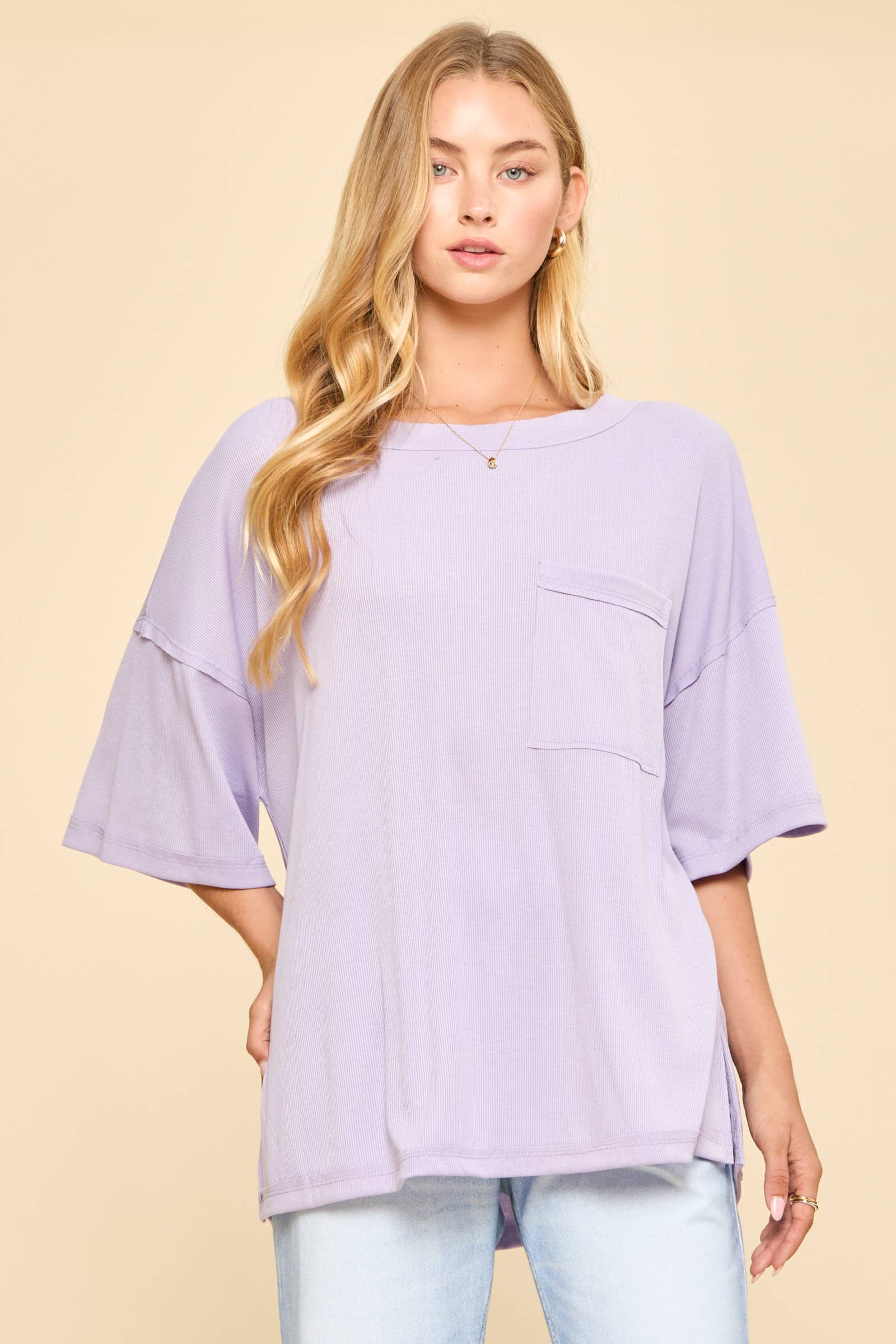 Embrace effortless style with this baby ribbed boyfriend shirt, designed for a relaxed flowy fit that flatters every figure. The pocket adds a functional touch, while a pleat on the back enhances the shirt's flow and movement. A unique patch detail gives a playful, modern twist to this piece. Knit, stretchy.