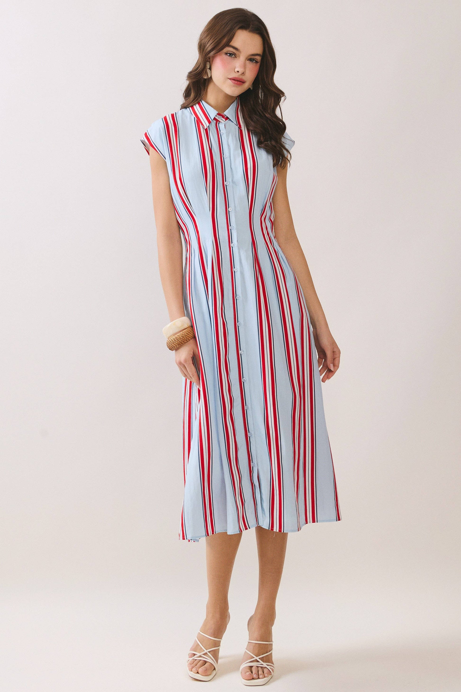A striped button-down midi dress featuring a fitted bodice that flows into a flattering A-line silhouette. Designed with a classic pointed collar and cap sleeves. Finished with side pockets and vertical stripe detailing to elongate the figure.