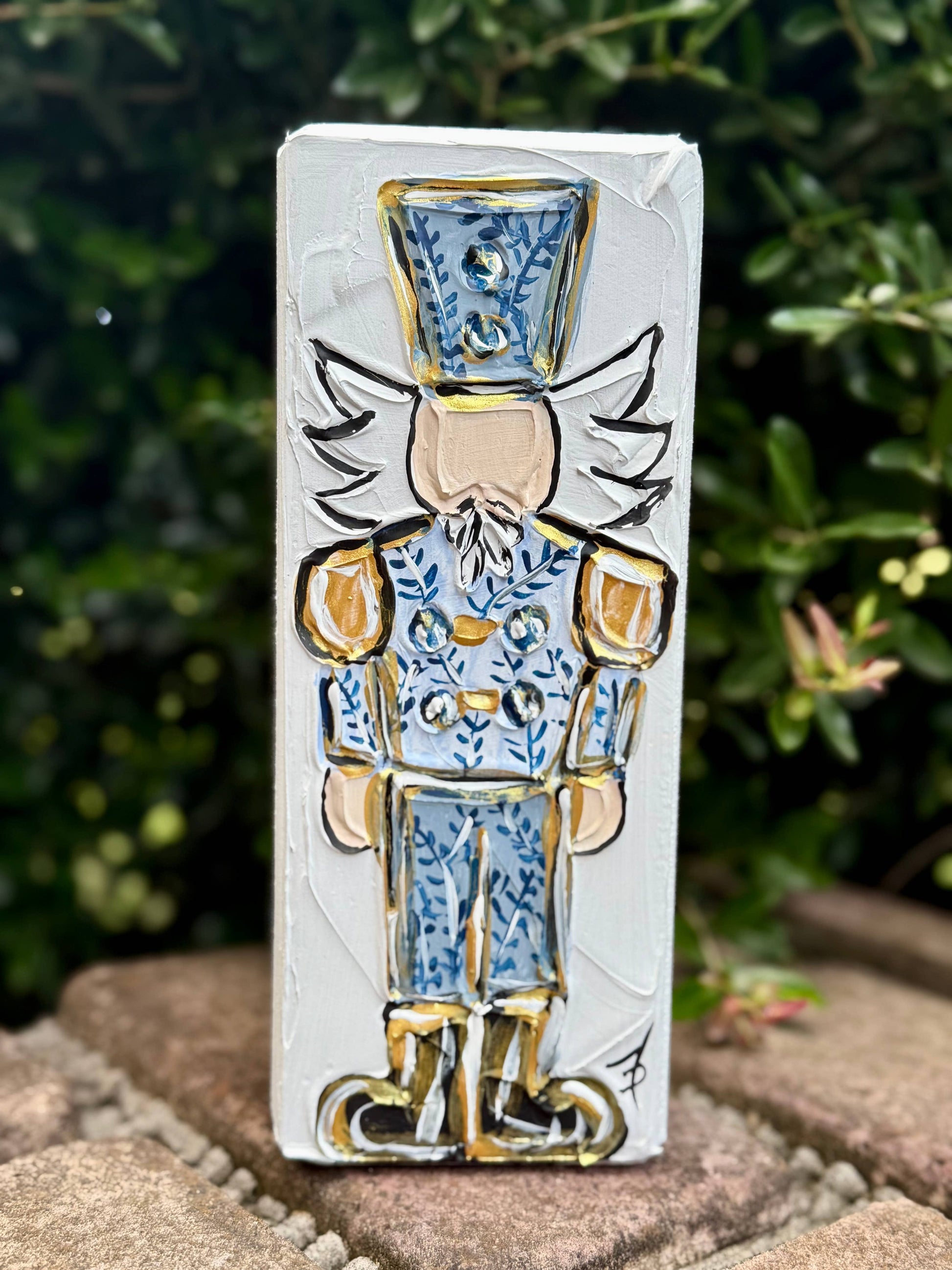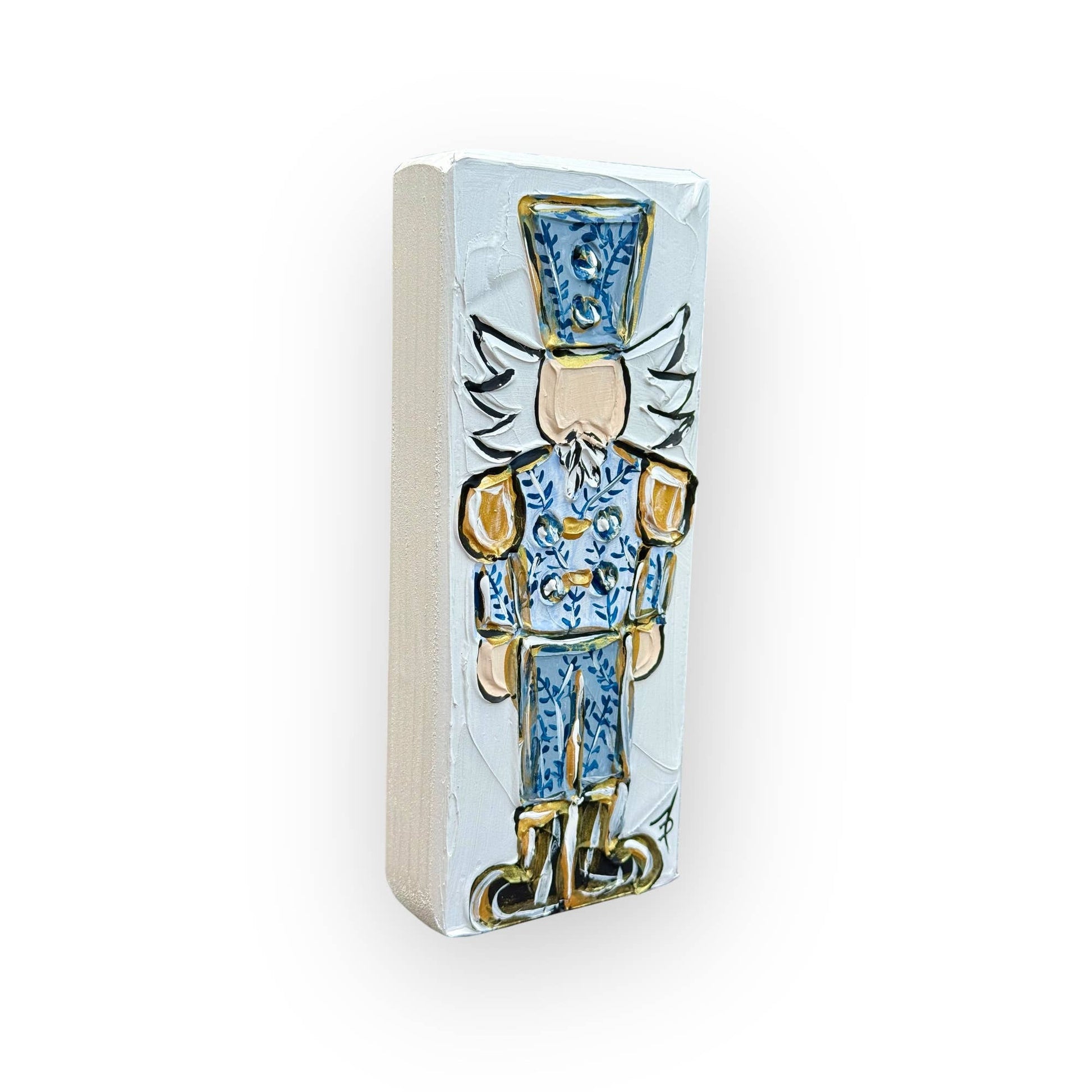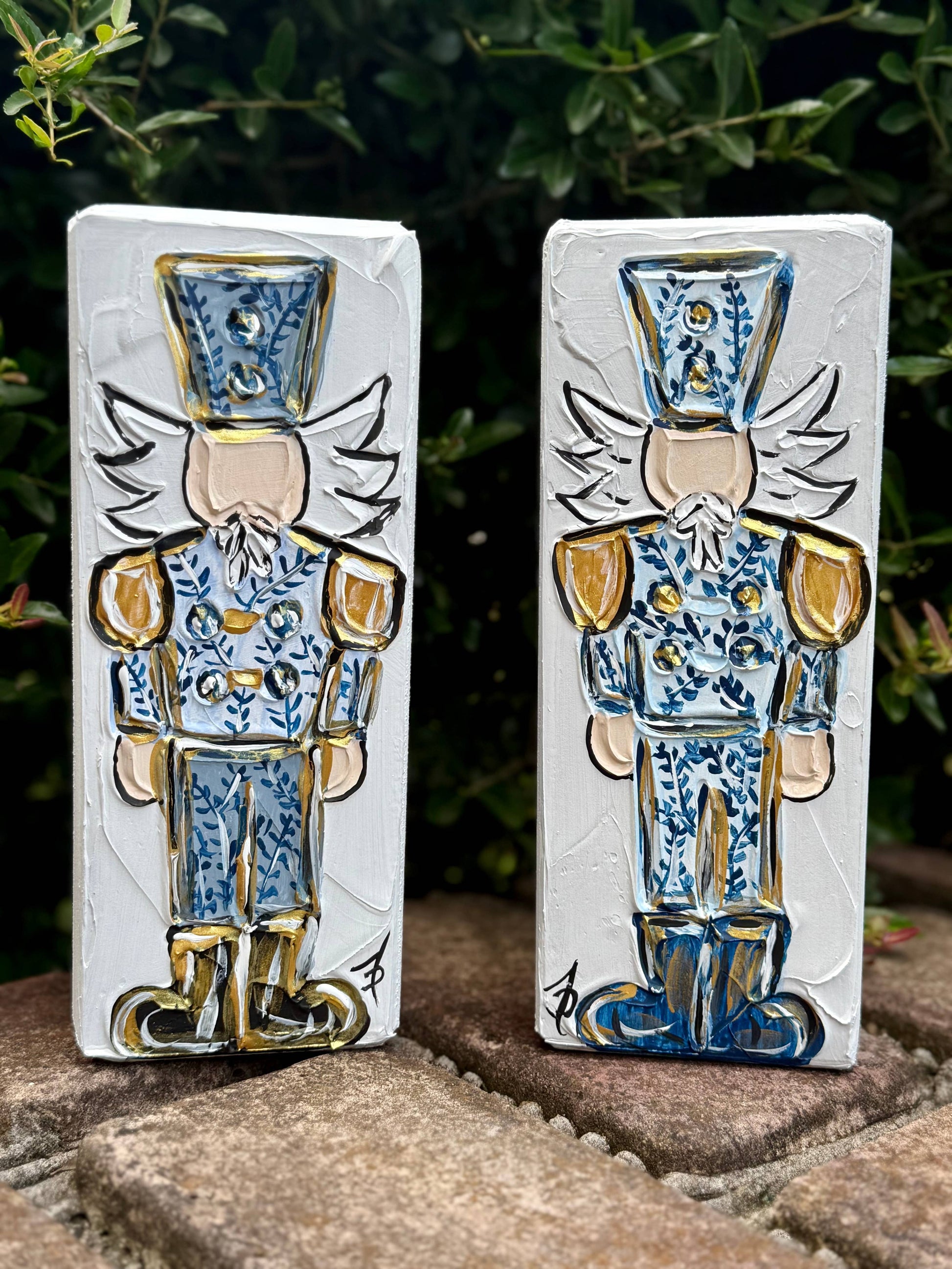 Our newest nutcracker design in the popular chinoiserie style. Each piece is an original work of art incorporating our unique textured medium style with acrylic paint. Each piece is highlighted using metallic gold. They stand on their own and would be a great addition to any holiday decor.