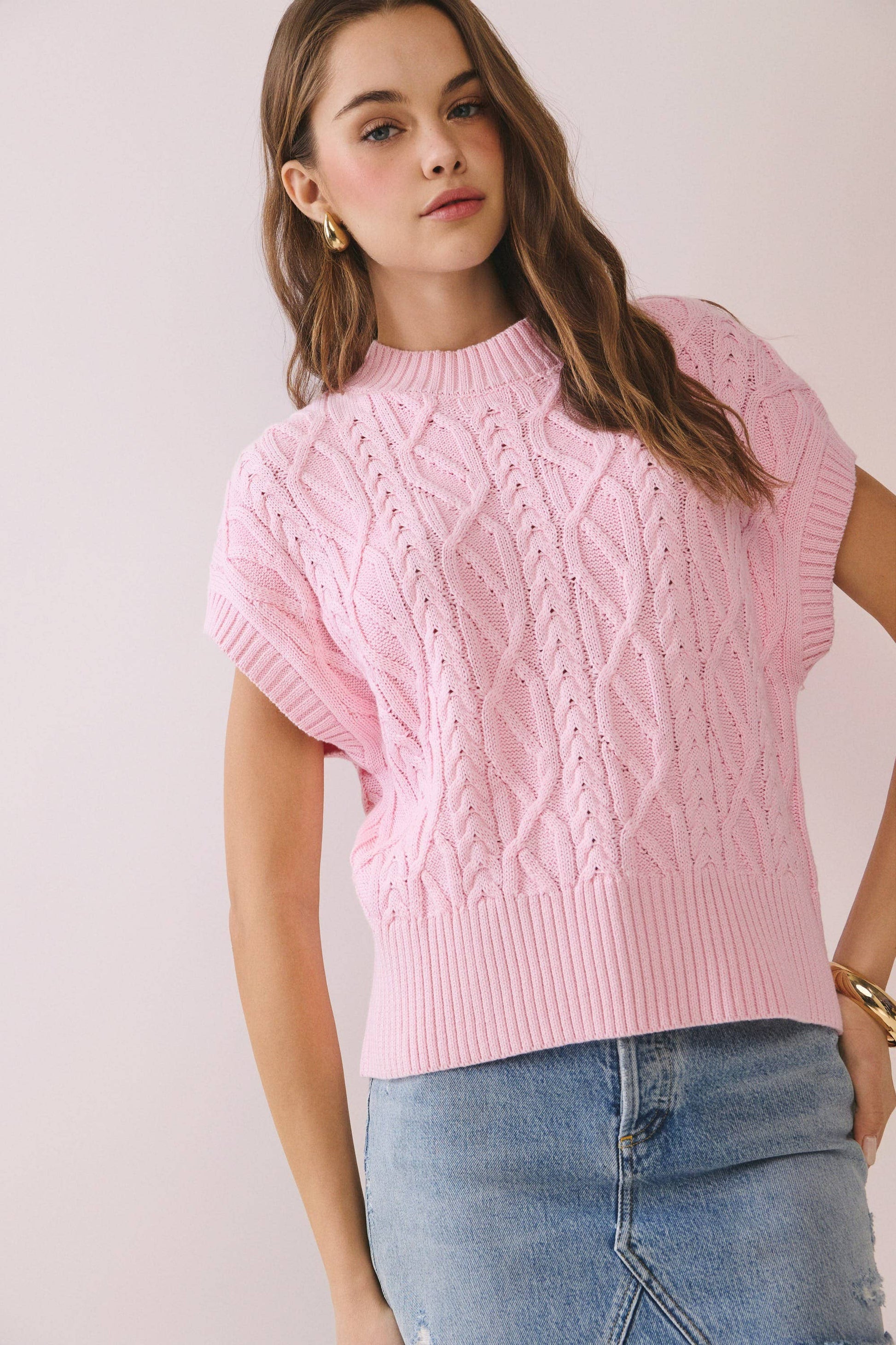 A sleeveless knit sweater top featuring a classic cable-knit design. Designed with a mock neckline and ribbed trimming at the neckline, armholes, and hem for added structure.