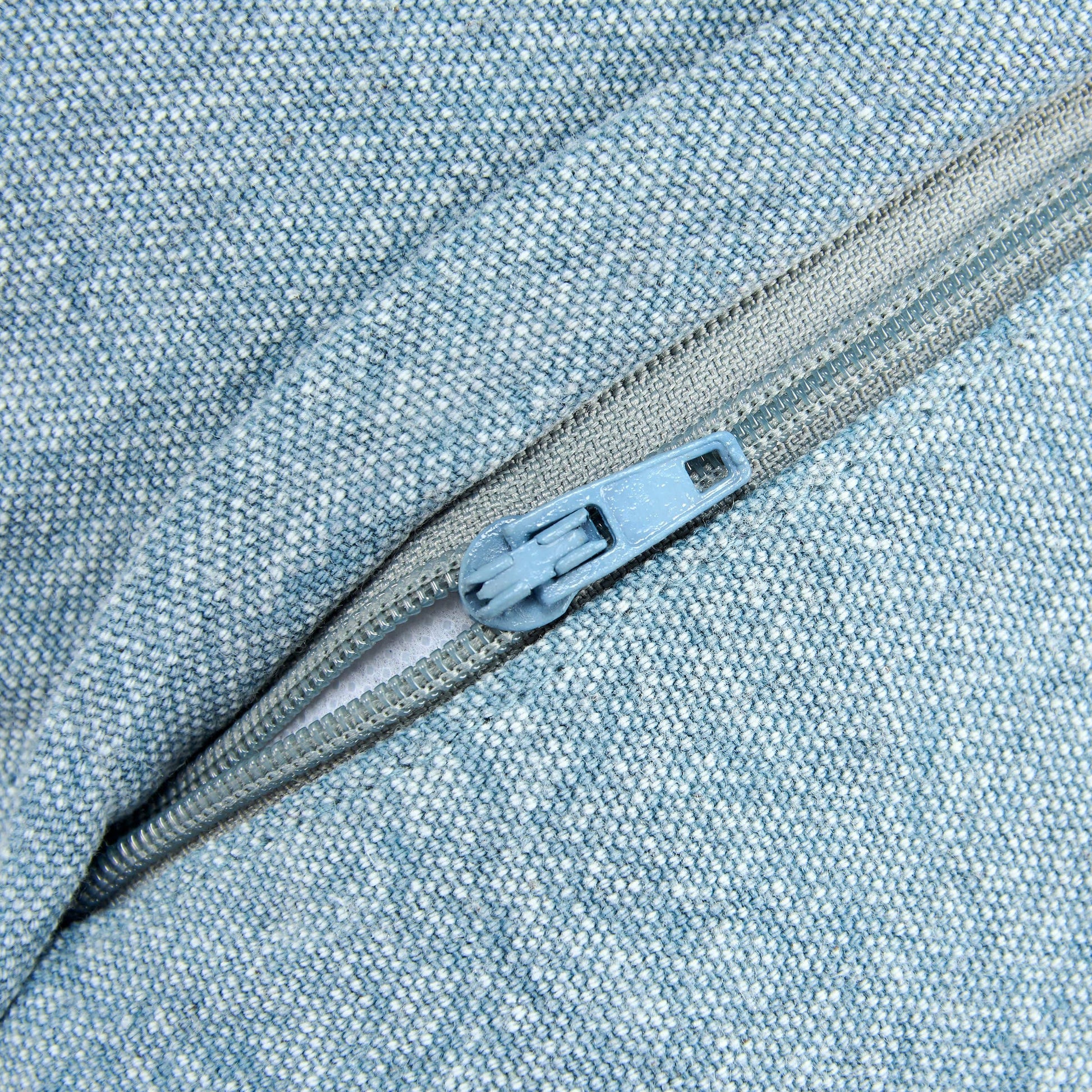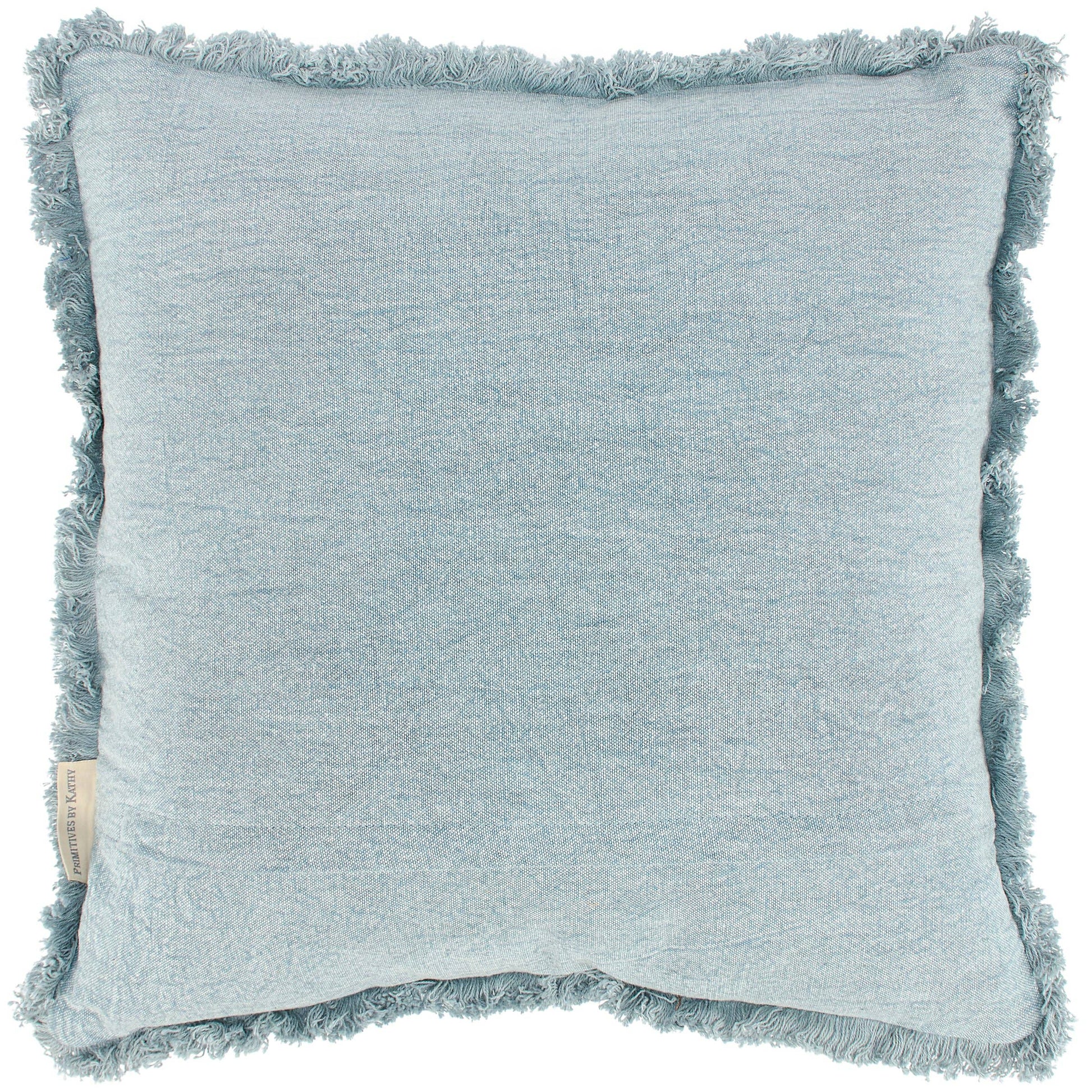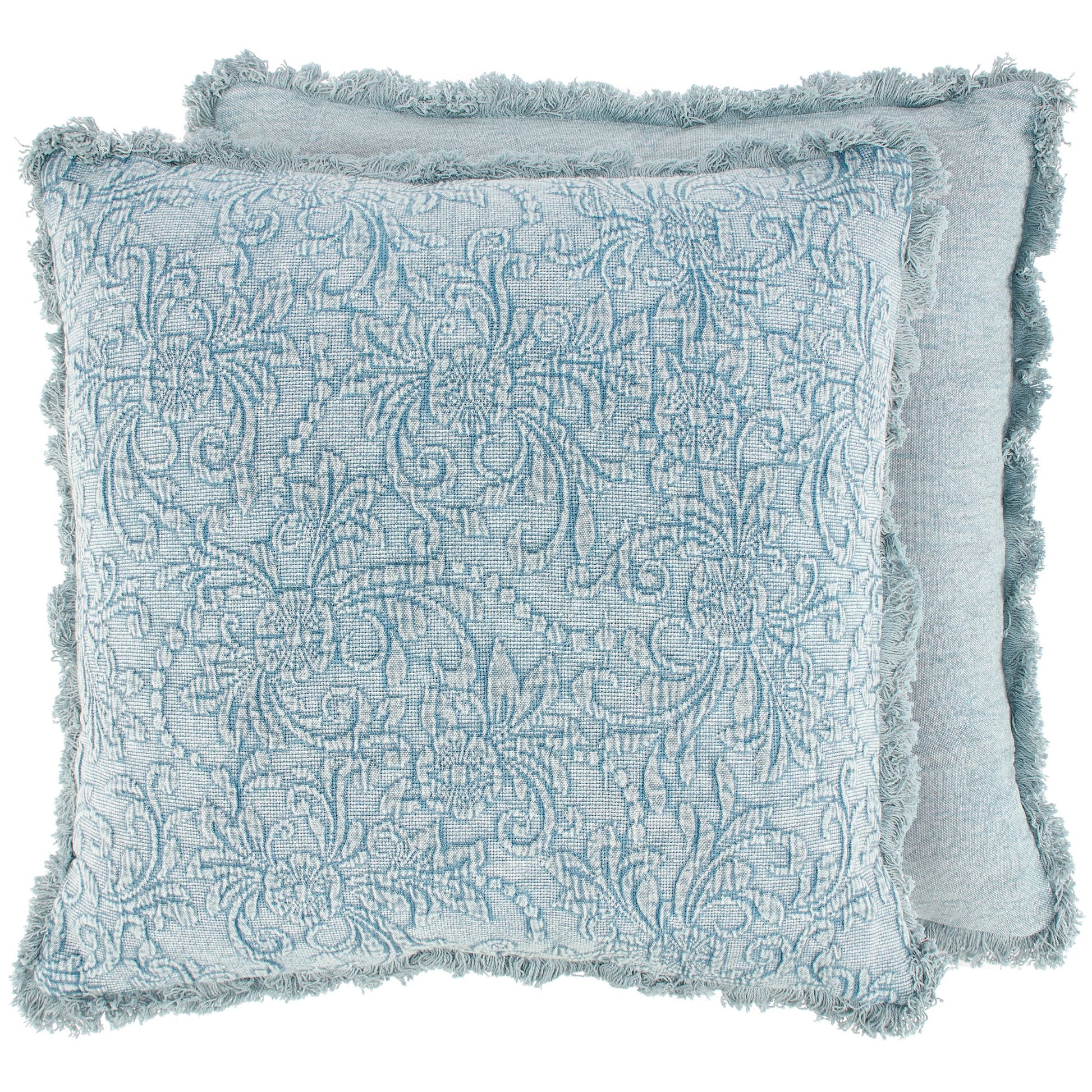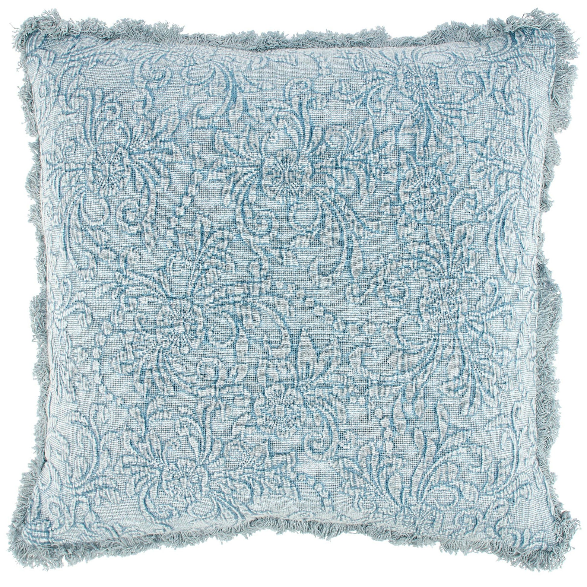 A decorative cotton throw pillow from our Home Collection displaying an embossed floral pattern on textured fabric in a vintage blue color palette with a coordinating fringe trim and stonewashed blue cotton on the back. Our Floral Blue pillow includes a zipper to easily remove and clean machine-washable pillow cover. Floral pillow contains polyester filling and is shipped vacuum-sealed for protection and storage. An everyday home accent that adds vintage style to any room.