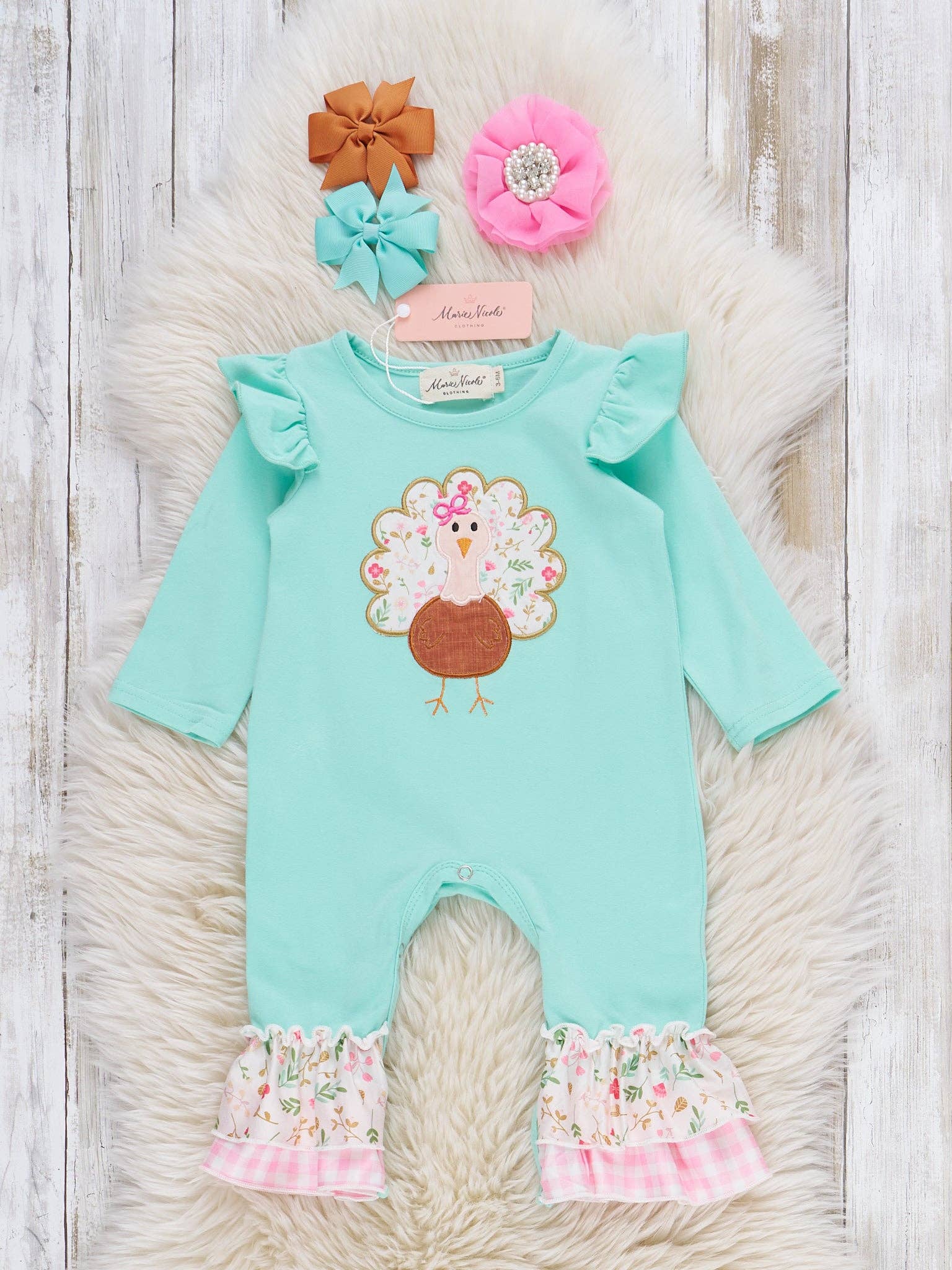 Bring Thanksgiving to the outdoors with the Gobble Garden Ruffle Outfit! This bright and floral one-piece from Marie Nicole Clothing captures garden joy in the adorable ruffles, picnic plaid, and a flowery, embroidered turkey. Your girl will stay comfortable and cheery in this sweet, little romper!