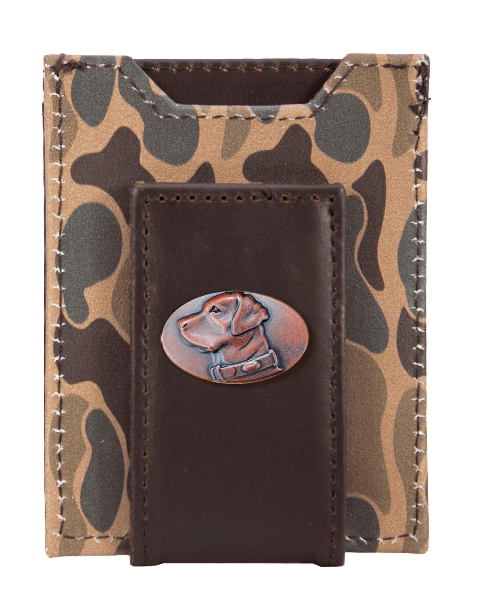 Show your Lab passion with an original Zep-Pro Old School Camo leather front pocket wallet. The dog imagery on these wallets taps into our intrinsic connection to nature and wildlife. It is a stylish and unique way to show enthusiasm while keeping important cards and cash organized. This Zep-Pro wallet is constructed of full grain leather with a Old School Camo print and features the Lab design, proudly displayed on the front. The metal concho emblem has an antique copper finish which perfectly accents this unique wallet.