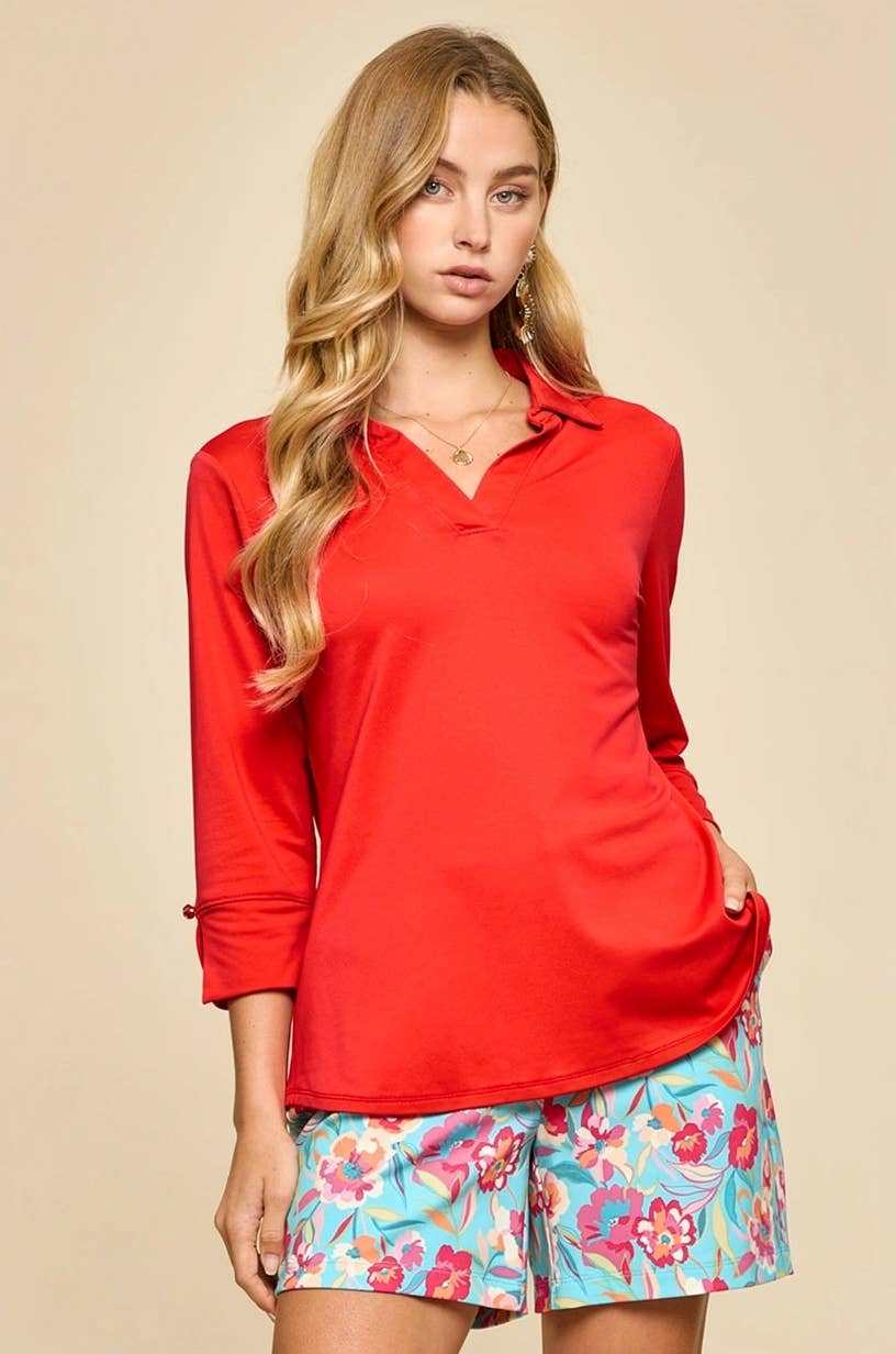 3/4" sleeve blouse made from lightweight sun protective inspired fabric that keeps you cool! It's perfect for days when you want coverage without feeling too warm. The soft, breathable material and relaxed fit make it an effortless choice for both sporty and casual looks-- From the court to brunch and beyond!