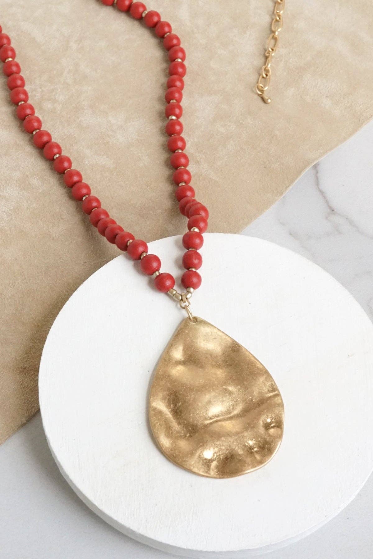 Long Wooden Bead Necklace with gold teardrop - red