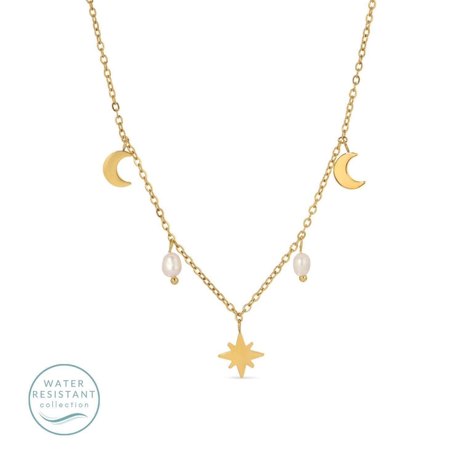 Add a touch of celestial charm with this delicate necklace featuring beautiful freshwater pearls, along with star and moon charms. Crafted from water-resistant 18K gold PVD-plated stainless steel, this 15.5" necklace is perfect for everyday wear, offering both durability and elegance. Whether you're dressing up for a special occasion or adding a bit of sparkle to your casual look, this charming piece brings a dreamy, timeless feel to any outfit.