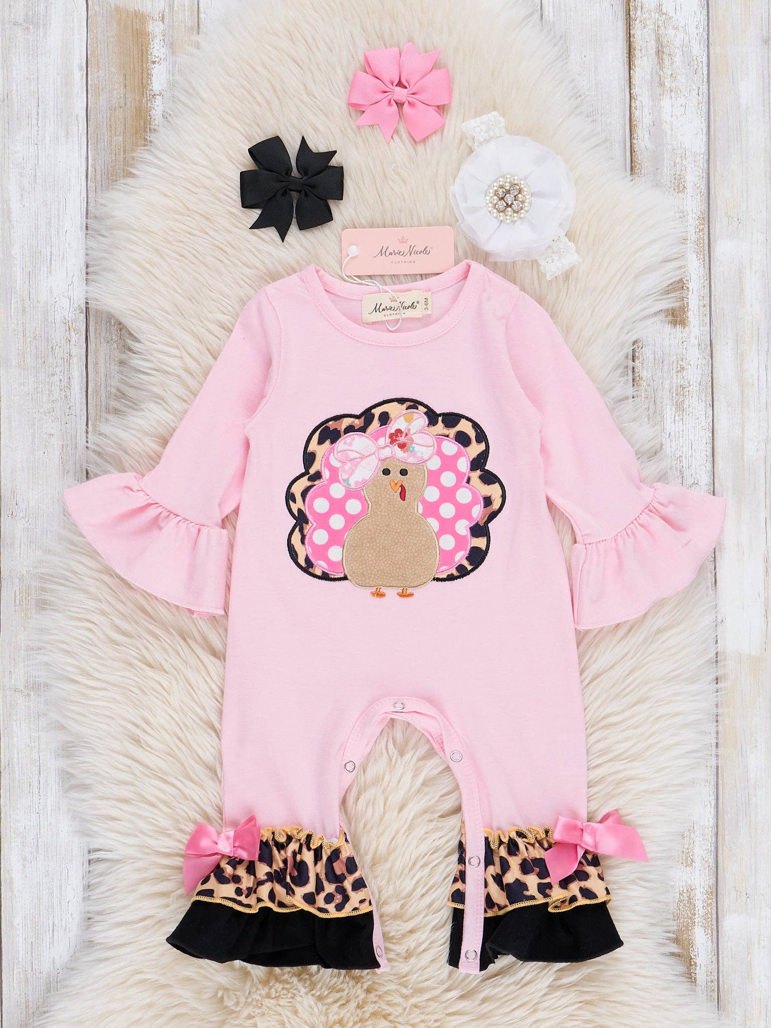 All your girls will feel pretty in pink with this sassy sister set! This pink romper features a turkey appliqué, bell sleeves, leopard ruffle details, & bow details at the ankles.