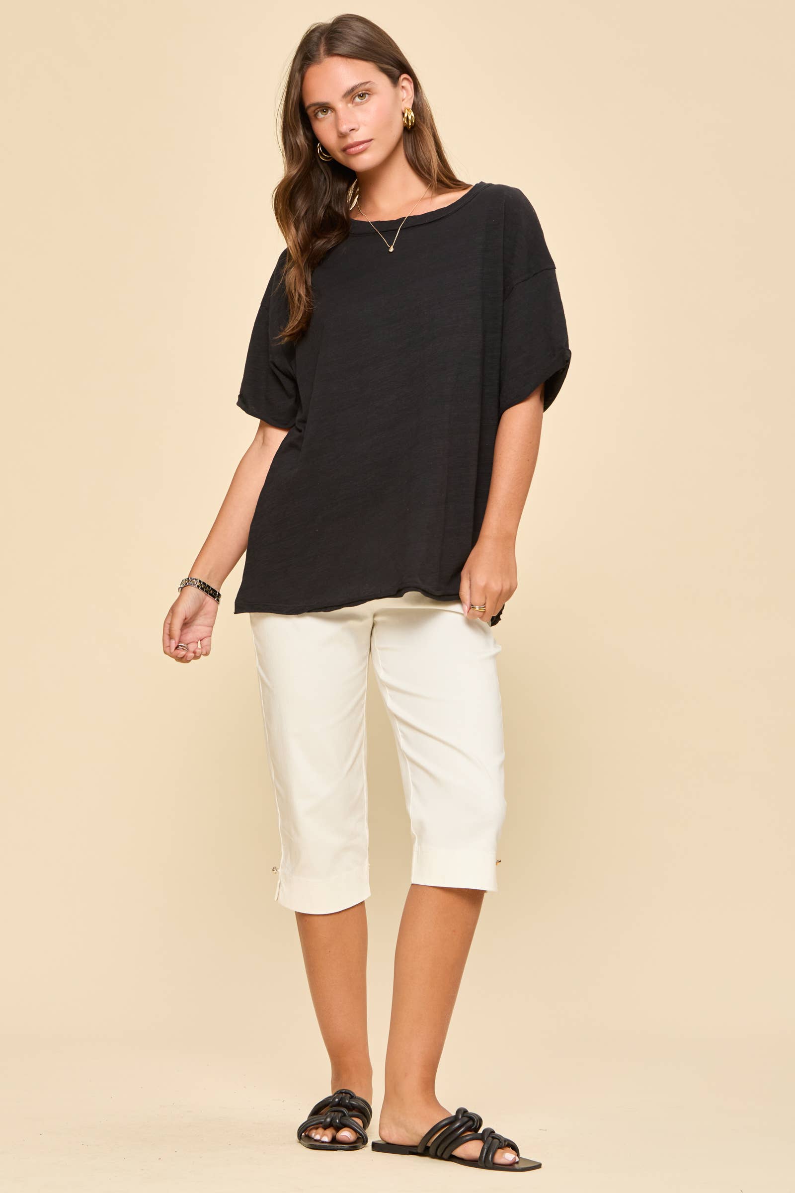 Keep it simple yet stylish with this basic short sleeve cotton top, designed for ultimate comfort and versatility. The soft, breathable cotton fabric ensures all day wearability, while the fun detail adds a unique touch. Knit, stretchy.