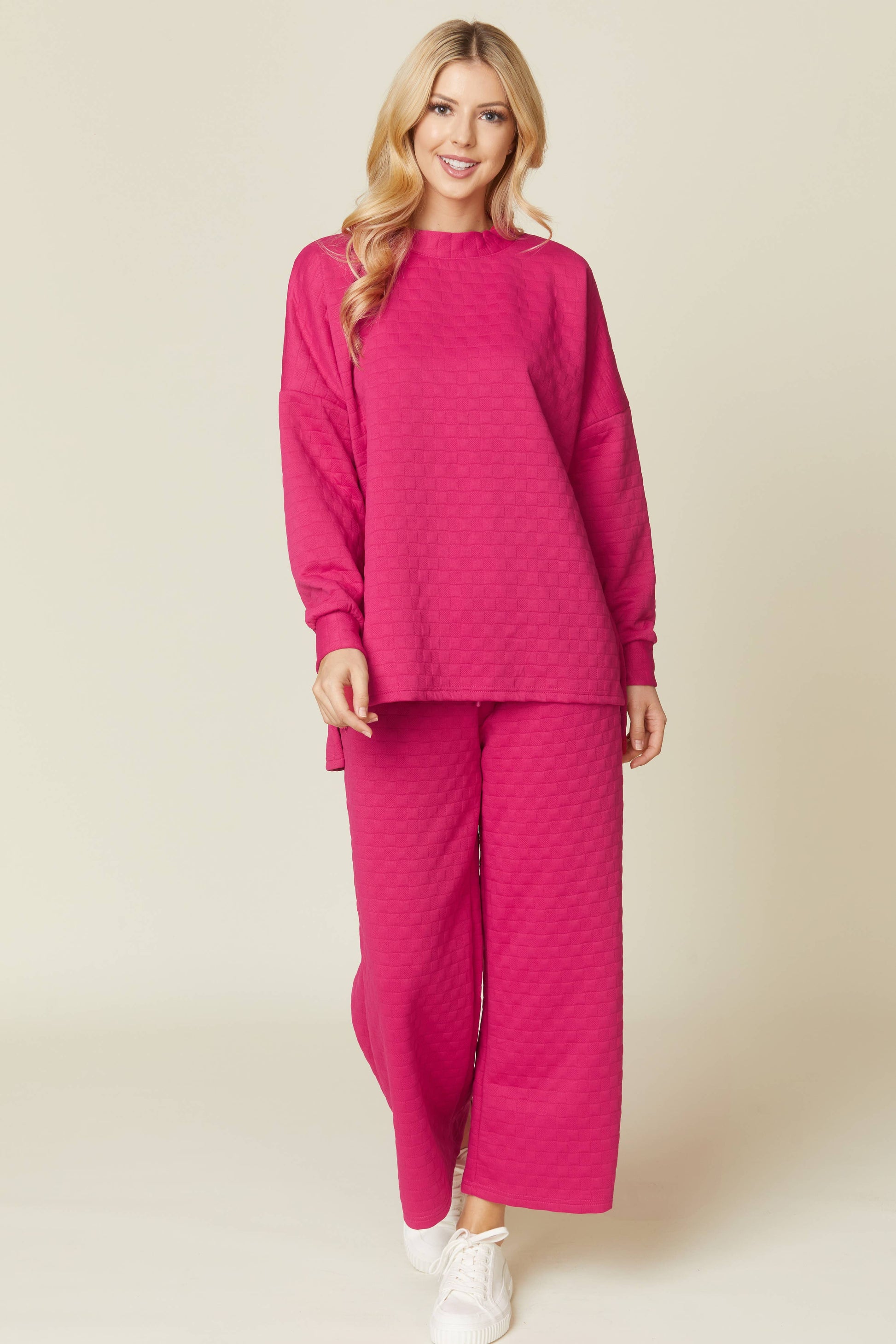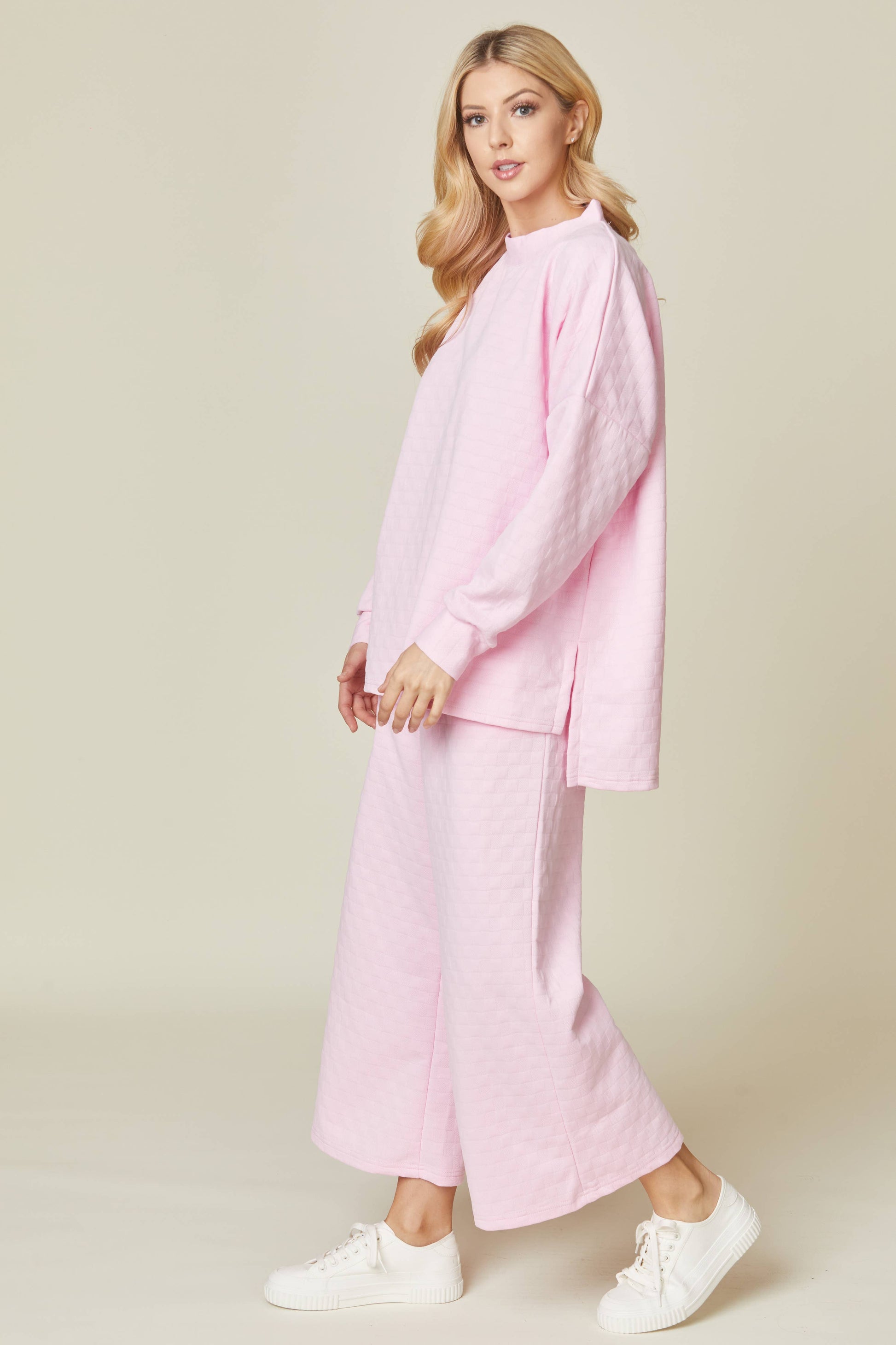 Solid quilted matching top and bottom set. Top features high neck, dropped shoulder, cuffed sleeves and slit hem. Bottom features drawstring waistline, side pockets and ankle length.