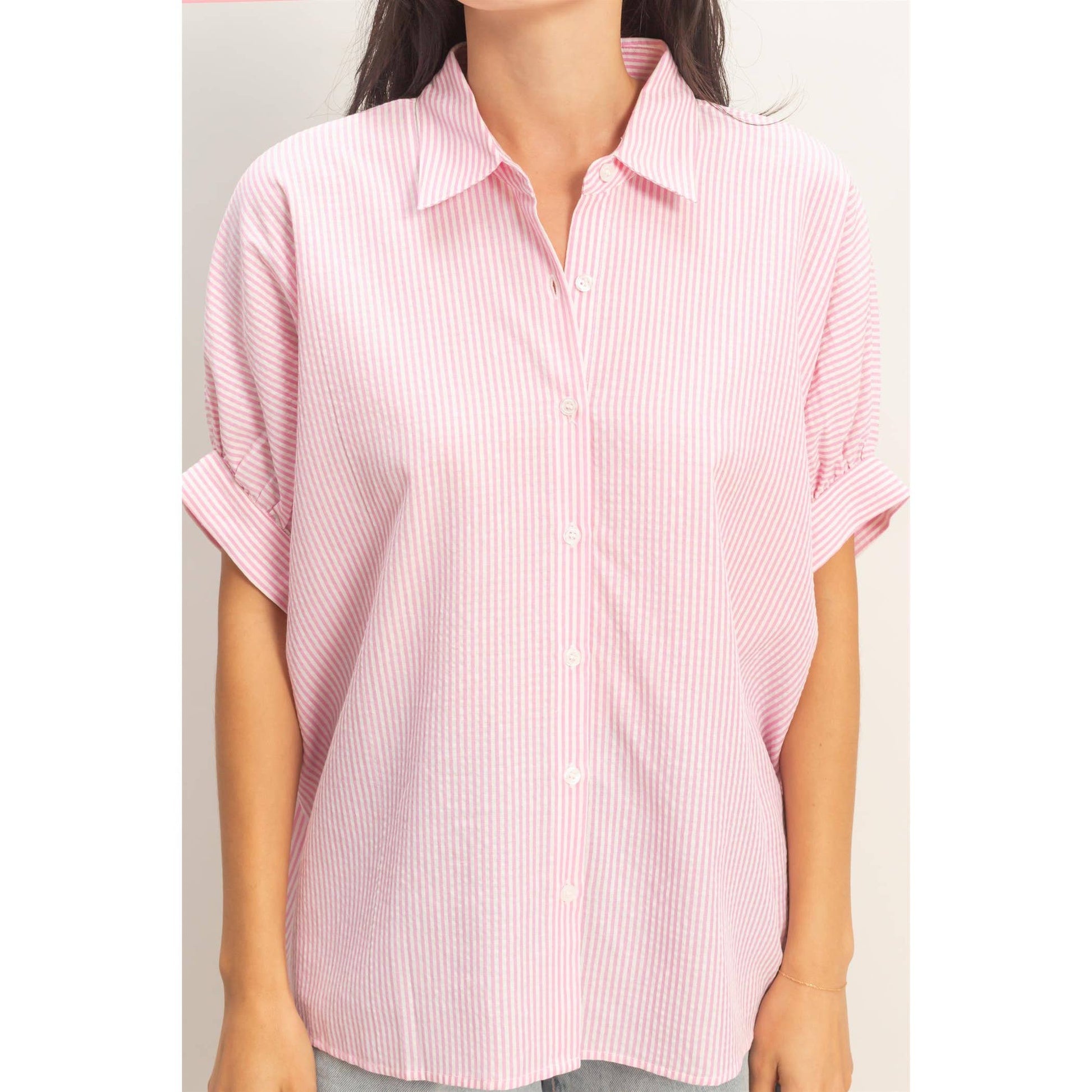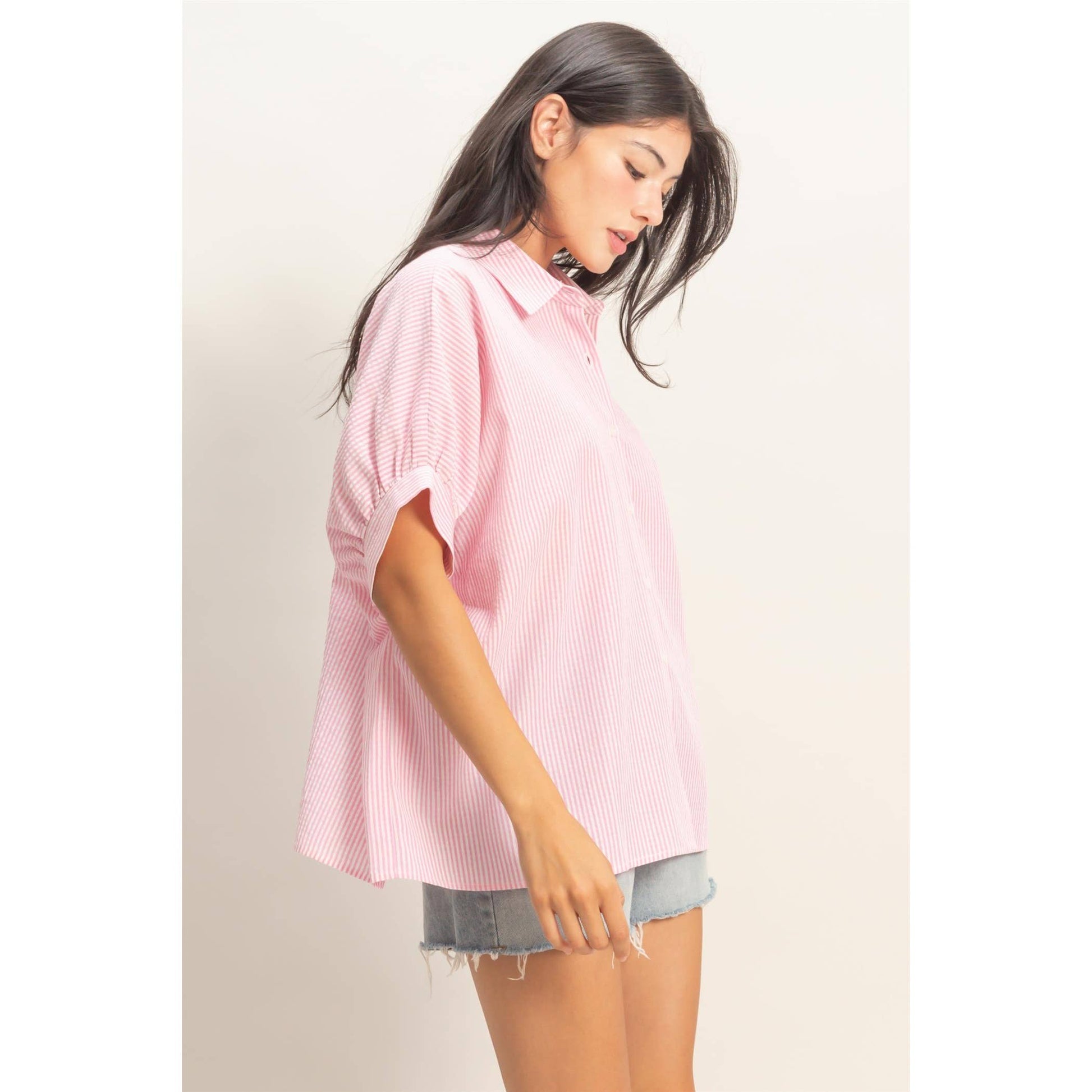 Striped Short Sleeve Button-Front Blouse