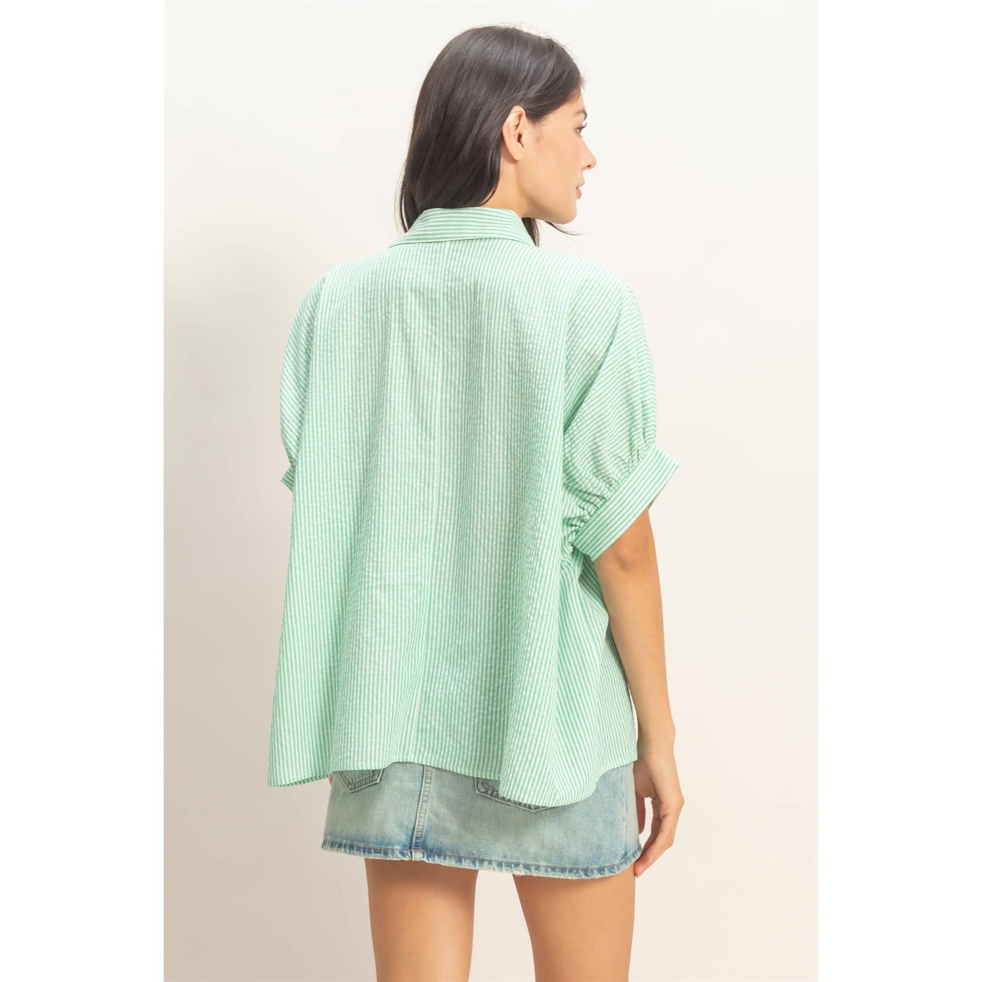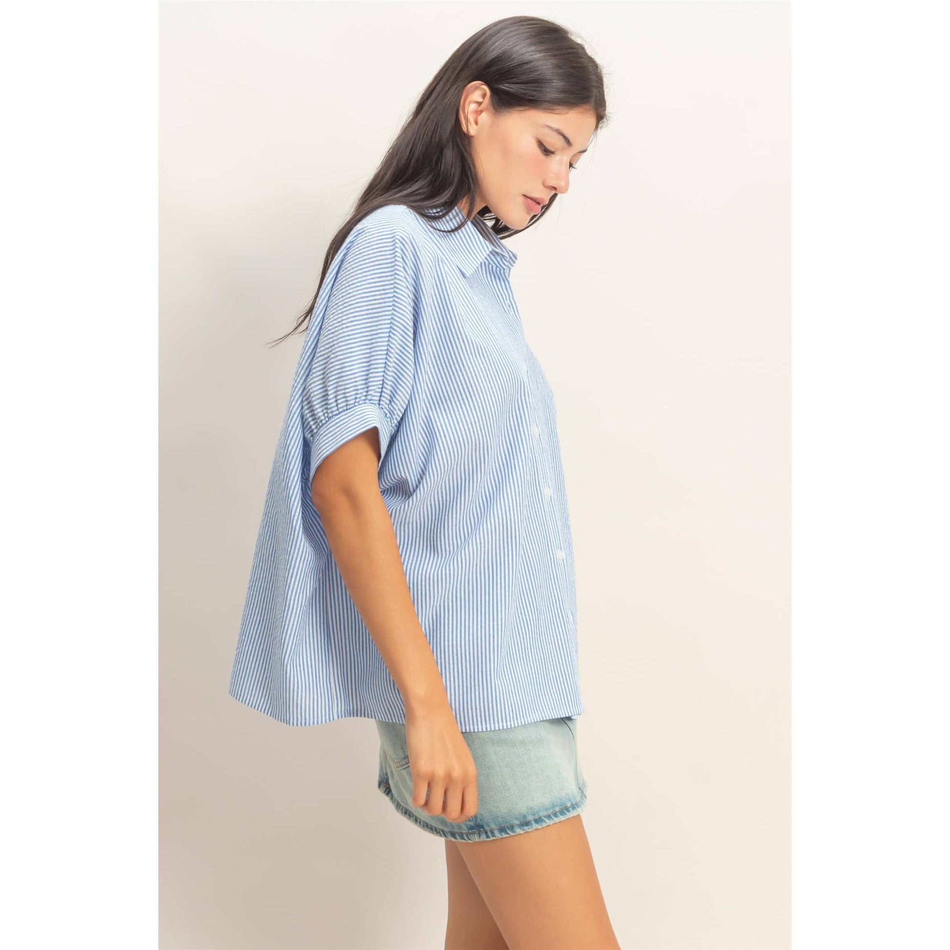 This button-front blouse is crafted from a soft striped woven and features a crisp point collar neckline, a full front placket, and short dolman sleeves cinched at the cuff with subtle gathering. The cut is an oversized, flowy fit with a slightly curved hem. This piece pairs well with slim black trousers and sleek loafers.